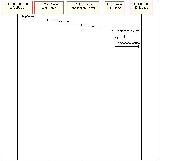 The activity diagram shows the interactions of the different components in the system. There are the Web pages which serve as the client. The web-pages are served by the Web Server. The web pages are not HTML pages but special pages which are capable of running code of a high-level programming language like Java/C++. Examples of these pages are ASP (Application Server Pages) or JSP (Java Server Pages). These web pages serve dynamic content. They make service calls to the ETS server which services these requests. The web pages run on the application server which compiles them into HTML pages and sends them to the Web Server to be sent to the client.