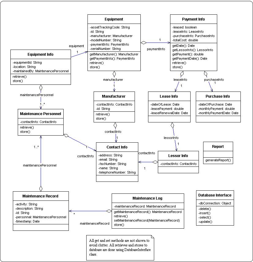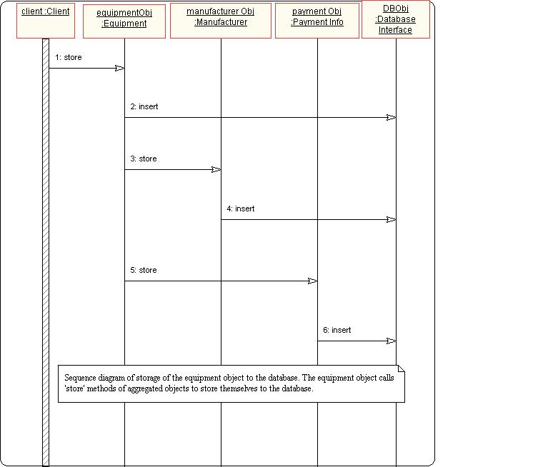 The sequence diagram below describes how an equipment object is stored into the database. The requirement here is that all information relevant to an equipment be stored into the database. There can be several sequence diagrams for different scenarios.